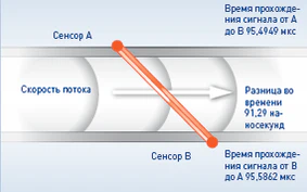 Принцип действия ультразвуковых расходомеров основан на измерении разницы во времени прохождения сигнала. При этом два ультразвуковых сенсора, расположенные по диагонали напротив друг друга, функционируют попеременно как излучатель и приёмник. Таким образом, акустический сигнал, поочередно генерируемый обоими сенсорами, ускоряется, когда направлен по потоку, и замедляется, когда направлен против потока. Разница во времени, возникающая вследствие прохождения сигнала по измерительному каналу в обоих направлениях, прямо пропорциональна средней скорости потока, на основании которой можно затем рассчитать объёмный расход. А использование нескольких акустических каналов позволяет компенсировать искажения профиля потока.