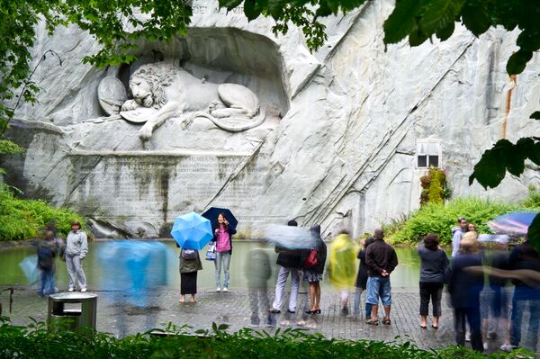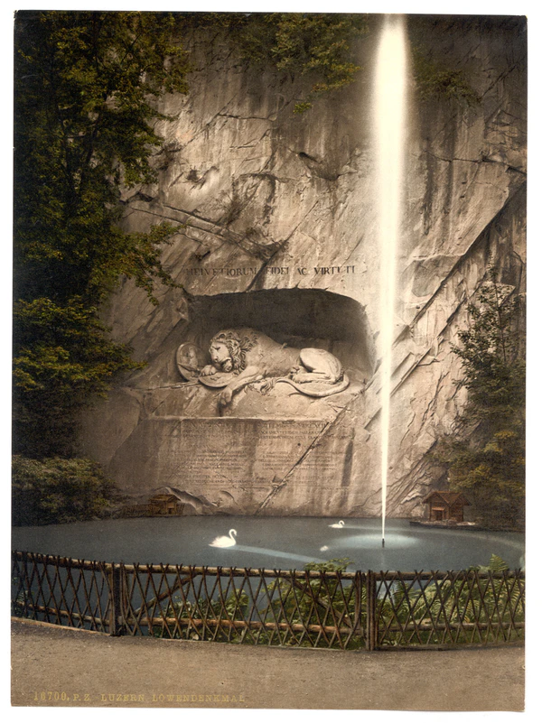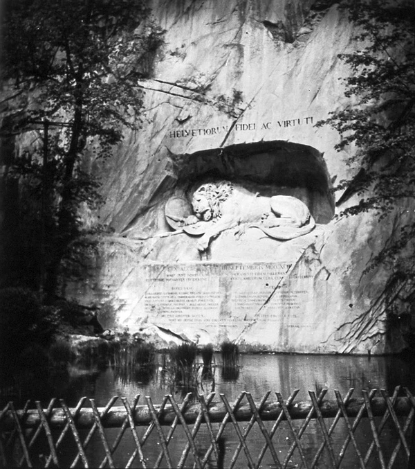 Лев лежит в своем логове на срезе невысокой отвесной скалы, ибо он высечен в горной породе. Фигура его огромна и преисполнена величия. Голову он склонил набок, сломанное копьё торчит из плеча, лапа лежит на лилиях Франции, защищая их. Виноградные лозы свешиваются со скалы, ветер играет в их листьях, где-то наверху бьет ключ, и прозрачные капли стекают в водоём у подножия скалы, а в неподвижной глади водоёма, как в зеркале, качается среди кувшинок отражение льва. Кругом зеленые деревья и трава. Это уютный, отдохновенный лесной уголок, отрешённый от шума, суеты и смятения, — и всё это так, как должно быть, — ведь львы и в самом деле умирают в подобных местах, а не на гранитных пьедесталах, воздвигнутых в городских парках, за чугунными решетками фасонного литья. Люцернский лев везде производил бы большое впечатление, но здесь он особенно на месте…