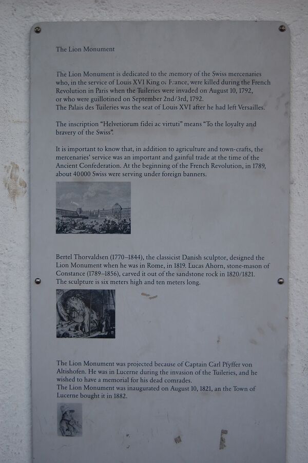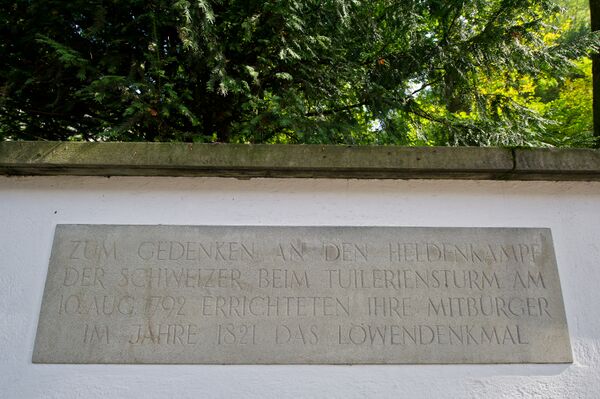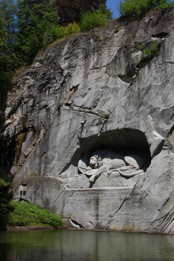 Над барельефом в скале высечена латинская надпись HELVETIORUM FIDEI AC VIRTUTI «Верности и отваге швейцарцев»; ниже барельефа — латинские цифры 760 и 350, соответствующие числу павших и уцелевших воинов. У подножия монумента в камне вырезаны имена солдат и офицеров, отдавших жизни во имя исполнения долга.