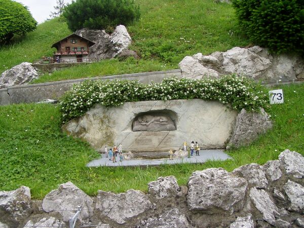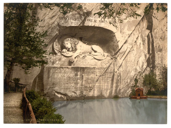 В Люцерне есть удивительный памятник; он сделан Торвальдсеном в дикой скале. Во впадине лежит умирающий лев; он ранен насмерть, кровь струится из раны, в которой торчит обломок стрелы; он положил молодецкую голову на лапу, он стонет, его взор выражает нестерпимую боль; кругом пусто, внизу пруд; всё это задвинуто горами, деревьями, зеленью