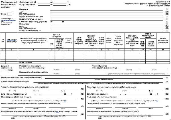 Для указания варианта использования документу присваивается в верхнем левом углу бланка УПД статус[2]: