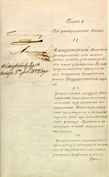 Александр I первоначально подписал 5 ноября 1804 года «Утвердительную грамоту Императорского Московского университета» и его устав. Вскоре были изданы аналогичные нормативные акты по Харьковскому и Казанскому университетам, которые почти полностью совпадали с предыдущим; таким образом, фактически появился типовой устав российских университетов.