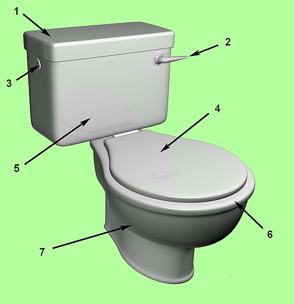 Основные части унитаза — чаша, сливной бачок и стульчак (сиденье) с крышкой. Существуют унитазы без сливного бачка, вместо которого используется смывной кран[8].