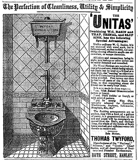 - В 1883 году англичанин Томас Твайфорд (фирма Twyford Bathrooms) изобрёл новую модель туалета — цельную (компакт), вместо более ранних, включавших чашу и трубу-поддон. Новую модель назвали Unitas[1] — единство[2][нет в источнике];