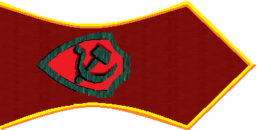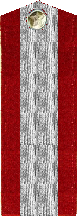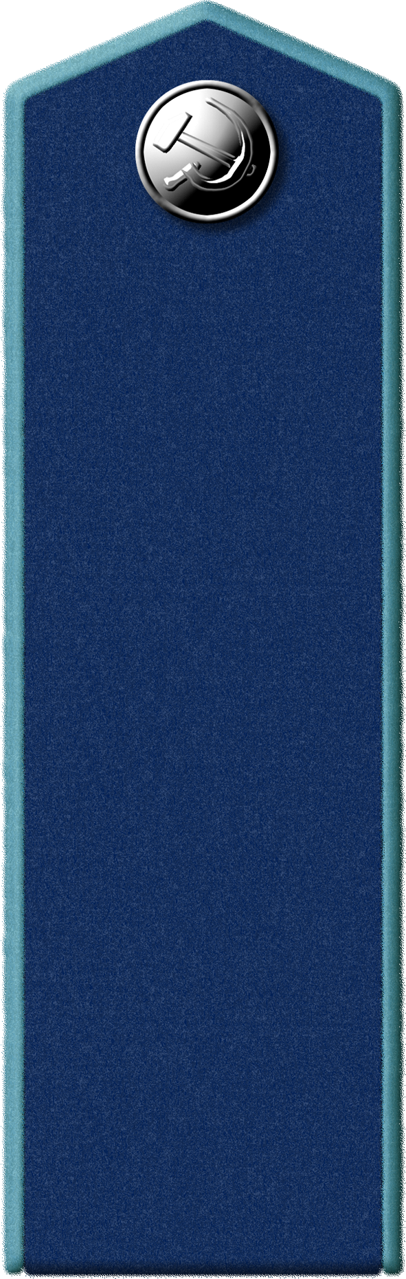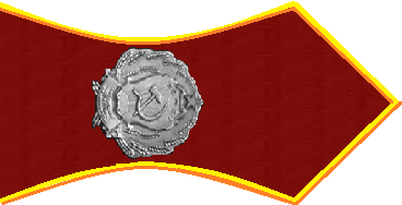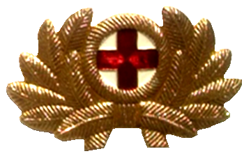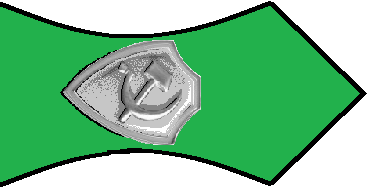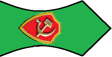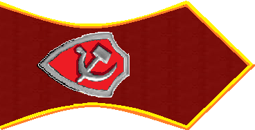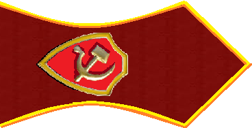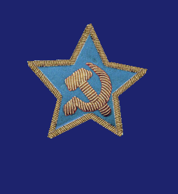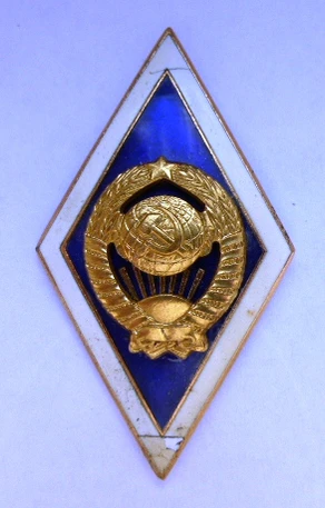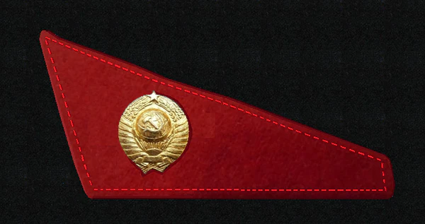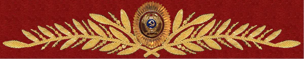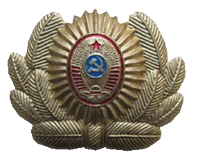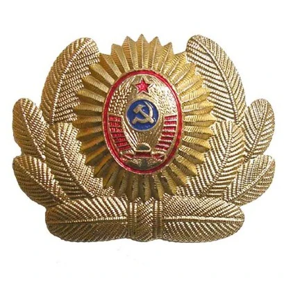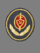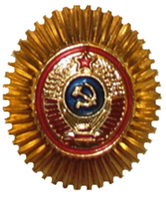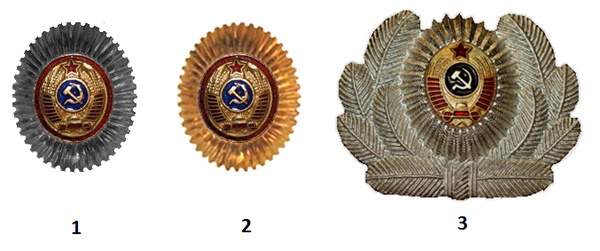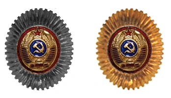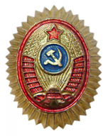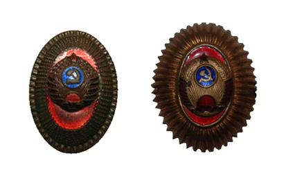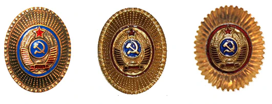 - Значок для головного убора — из эмалированного щита красного цвета длиной — 2 см, шириной — 1,5 см, окаймленного скошенным золотым ободком шириной 3 мм. На щите расположены золотые серп и молот. Щит расположен на венке из колосьев.