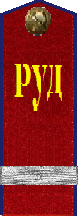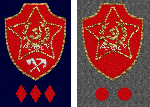 - знаки различия по должностям для работников милиции: из крапового сукна, нашитые нитками соответствующего цвета на петлицу. Знаки различия состояли из ромбов, квадратов и треугольников. При этом все милицейские должности были распределены по так называемым составам и разрядам.