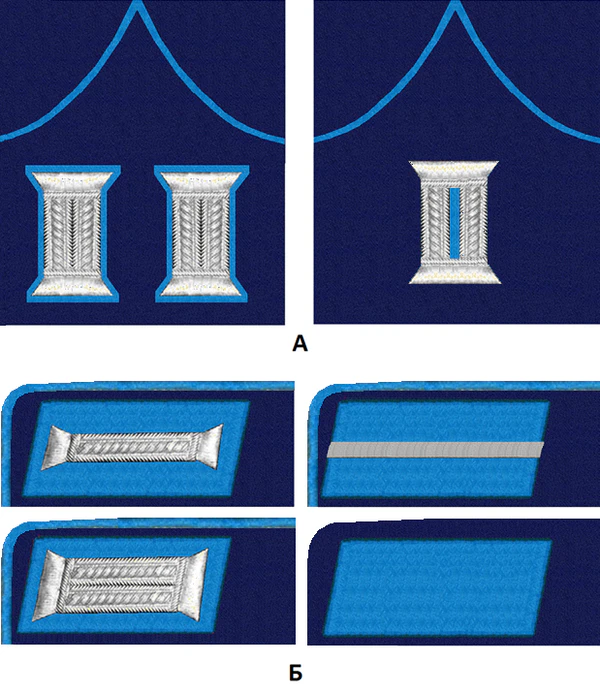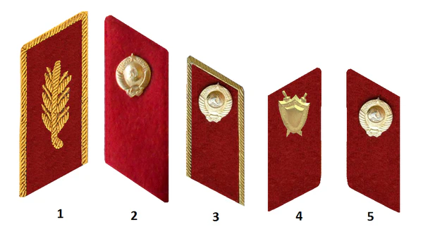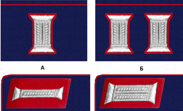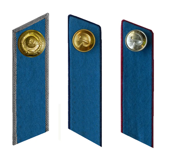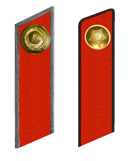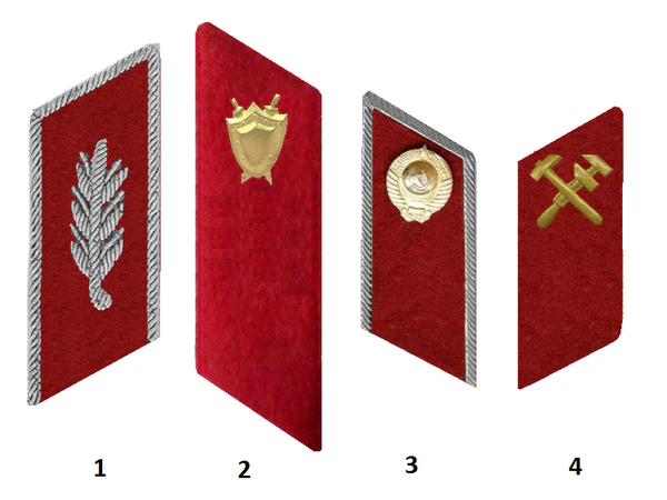 Петлицы удлиненной формы, расширяющиеся по кривой линии кверху, затем суживались, заканчиваясь слегка заостренным углом, близким к прямому, изготавливались из сукна с окантовкой. Цвет петлиц и канта определялся характером службы сотрудника: