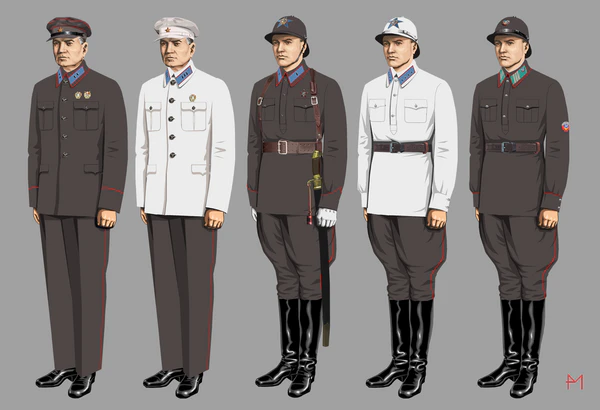 - мундир летний изготавливался из тонкого темно-синего сукна. На груди два нагрудных нашивных кармана с одномысковыми клапанами, застегивающимися на одну форменную малую пуговицу. Воротник для командного состава отложной, для милиционеров — стойка. Мундир застегивается на пять форменных большого размера пуговиц. На воротнике рядового состава еще две малые форменные пуговицы, как на гимнастерке. Рукава с обшлагами, на которых крепится по две форменные малого размера пуговицы. На спинке мундира — хлястик.