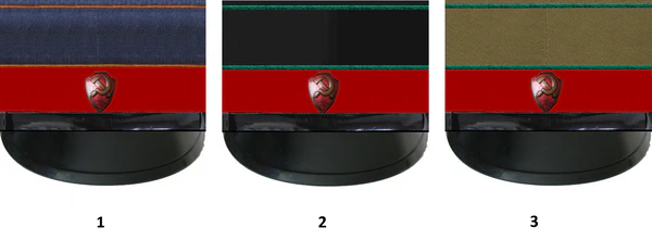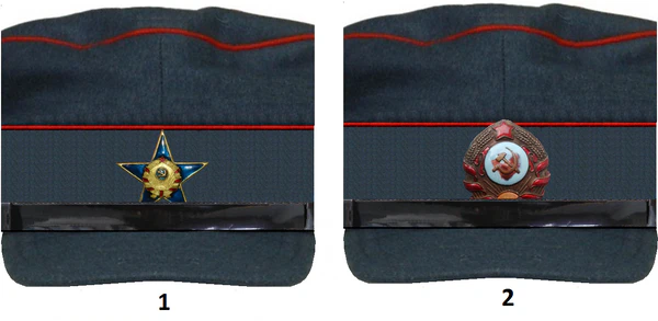 - фуражка из темно-синего сукна бельгийского фасона с козырьком из черной лакированной кожи. Над козырьком на двух форменных пуговицах — кожаный лакированный подбородный ремень черного цвета. Над подбородным ремнем — значок милиции.