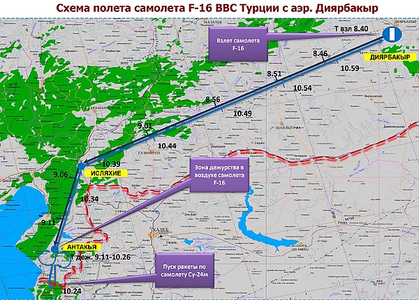 27 ноября Главнокомандующий ВКС Виктор Бондарев представил российскую версию реконструкции событий 24 ноября[2]. По расчётам российских военных, перехват самолёта Су-24М из положения дежурства на земле с аэродрома Диярбакыр невозможен из-за большого времени подлёта. По утверждению Бондарева, турецкие F-16C были подняты в воздух заблаговременно и в течение 1 часа 15 минут дежурили в зоне инцидента на высоте 2400 метров, что говорит о «готовности действовать из засады» над территорией Турции, а истребитель, сбивший российский самолёт, 40 секунд находился в воздушном пространстве Сирии[2][50]. По словам Бондарева, способ захода F-16 на цель говорит о наведении истребителя с земли, а особенности маневрирования истребителя после пуска ракеты с уходом из зоны видимости ПВО говорят о спланированности атаки[51][52].