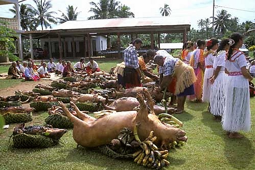 Свинина, цыплята и черепаха являются обязательным атрибутом праздничного стола. Тогда же употребляются кава и импортируемые алкогольные напитки.
