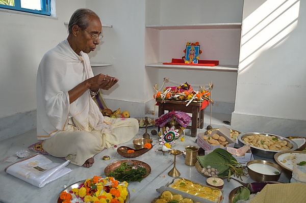 В ходе пуджи божеству предлагаются фрукты, специально приготовленная пища, вода, благовония, цветы и другие подношения. Каждая сампрадая имеет собственные правила для выполнения ритуала, которым должны следовать ее члены. Как акт преданности ритуал является одновременно служением божеству и средством завоевать его расположение. Ритуал, ежедневно проводимый в домашних условиях, представляет собой сокращенную версию служения, выполняемого в храмах, особенно в праздничные дни.