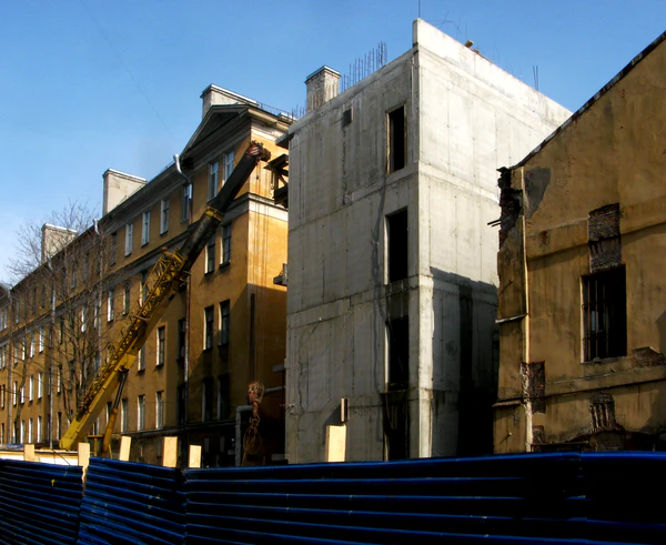 - Строительство нового, не предусмотренного ранее объекта в исторически сложившемся жилом квартале. В этом случае строительство ведётся обычно на территории парка или сквера.