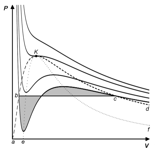 Из рисунка, на котором изображены изотермы газа Ван-дер-Ваальса, видно, что ниже некоторой температуры зависимость перестаёт быть монотонной: образуется петля Ван-дер-Ваальса, в которой увеличению давления соответствует увеличение объёма, что противоречит законам термодинамики. Появление петли означает, что уравнение Ван-дер-Ваальса в данной области изменения и перестаёт описывать действительную ситуацию, когда имеет место фазовый переход газ — жидкость и реальная изотерма представляет собой отрезок прямой — конноду (ноду), соединяющую две фигуративные точки на бинодали.