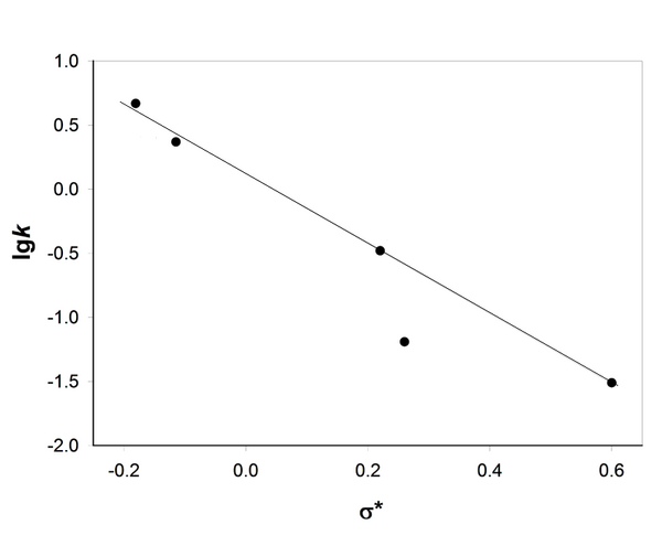 Отрицательное значение ρ* свидетельствует о том, что в переходном состоянии на реакционном центре возникает частичный положительный заряд, а при переходе от электронодонорных заместителей к электроноакцепторным реакционноспособность соединения в данной реакции уменьшается. При положительной величине ρ* наблюдается обратная зависимость.