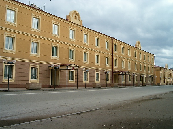 Здание областного акимата, в прошлом — Русский Торгово-промышленный коммерческий банк. В открытую пасть львов, находящихся в нишах подъезда боится положить руку каждое новое поколение уральских мальчишек. Построено в 1896 году архитектором А. Бунькиным, по сторонам балкона здание украшали по очереди скульптуры казаков с огромными осетрами, затем традиционные советские рабочий и колхозница. После Революции здание занимали советы рабочих депутатов и их исполнительные комитеты.