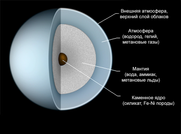 Стандартная модель Урана предполагает, что Уран состоит из трёх частей: в центре — каменное ядро, в середине — ледяная оболочка, снаружи — водородно-гелиевая атмосфера[8][55]. Ядро является относительно маленьким, с массой приблизительно от 0,55 до 3,7 земных масс и с радиусом в 20 % от радиуса всей планеты. Мантия (льды) составляет бо́льшую часть планеты (60 % от общего радиуса, до 13,5 земных масс). Атмосфера при массе, составляющей всего 0,5 земных масс (или, по другим оценкам, 1,5 земной массы), простирается на 20 % радиуса Урана[8][55]. В центре Урана плотность должна повышаться до 9 г/см3, давление должно достигать 8 млн бар (800 ГПа) при температуре в 5000 К[54][55]. Ледяная оболочка фактически не является ледяной в общепринятом смысле этого слова, так как состоит из горячей и плотной жидкости, являющейся смесью воды, аммиака и метана[8][55]. Эту жидкость, обладающую высокой электропроводностью, иногда называют «океаном водного аммиака»[56]. Состав Урана и Нептуна сильно отличается от состава Юпитера и Сатурна благодаря «льдам», преобладающим над газами, оправдывая помещение Урана и Нептуна в категорию ледяных гигантов[57].