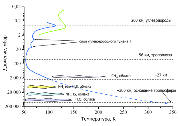 Тропосфера обладает сложным строением: предположительно, водные облака могут находиться в промежутке давления от 50 до 100 бар, облака гидросульфида аммония — в диапазоне 20—40 бар, облака аммиака и сероводорода — в диапазоне 3—10 бар. Метановые же облака могут быть расположены в промежутке между 1 и 2 барами[9][80][85][94]. Тропосфера — очень динамичная часть атмосферы, и в ней хорошо видны сезонные изменения, облака и сильные ветры[11].
