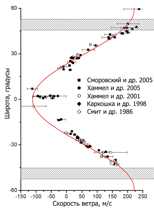 Отслеживание различных облаков позволило определить зональные ветры, дующие в верхней тропосфере Урана[11]. На экваторе ветры являются ретроградными, то есть дуют в обратном по отношению к вращению планеты направлении, и их скорости (так как движение обратно вращению) составляют −100 и −50 м/с[11][100]. Скорости ветров стремятся к нулю с увеличением расстояния от экватора вплоть до широты ± 20°, где ветра почти нет. Ветра начинают дуть в направлении вращения планеты вплоть до полюсов[11]. Скорости ветров начинают расти, достигая своего максимума в широтах ±60° и падая практически до нуля на полюсах[11]. Скорость ветра на широте в −40° колеблется от 150 до 200 м/с, а дальше наблюдениям мешает «Южное кольцо», своей яркостью затеняющее облака и не позволяющее вычислить скорость ветра ближе к южному полюсу. Максимальная же скорость ветра, замеченная на планете, была зарегистрирована на северном полушарии на широте +50° и равняется более чем 240 м/с[11][100][105].