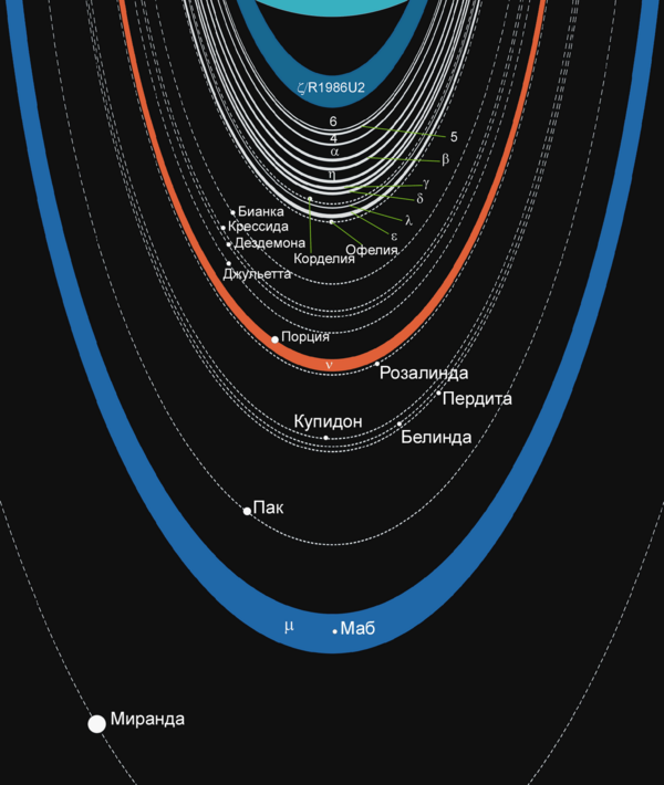 Названия для них выбраны по именам персонажей произведений Уильяма Шекспира и Александра Поупа[55][114]. Можно выделить пять основных самых крупных спутников: это Миранда, Ариэль, Умбриэль, Титания и Оберон[55]. Спутниковая система Урана наименее массивна среди спутниковых систем газовых гигантов. Даже суммарная масса всех этих пяти спутников не составит половины массы Тритона, спутника Нептуна[53]. Наибольший из спутников Урана, Титания, имеет радиус всего в 788,9 км, что менее половины радиуса земной Луны, хотя и больше, чем у Реи — второго по величине спутника Сатурна. У всех лун относительно низкие альбедо — от 0,20 у Умбриэля до 0,35 у Ариэля[12]. Луны Урана состоят изо льда и горных пород в соотношении примерно 50 на 50. Лёд может включать в себя аммиак и углекислый газ[63][115]. Среди спутников у Ариэля, судя по всему, самая молодая поверхность: на нём меньше всего кратеров. Поверхность Умбриэля, судя по степени кратерированности, скорее всего, самая старая[12][63]. На Миранде имеются каньоны до 20 километров глубиной, террасы и хаотичный ландшафт[12]. Одна из теорий объясняет это тем, что когда-то Миранда столкнулась с неким небесным телом и развалилась на части, а потом «собралась» силами притяжения снова[63][116].