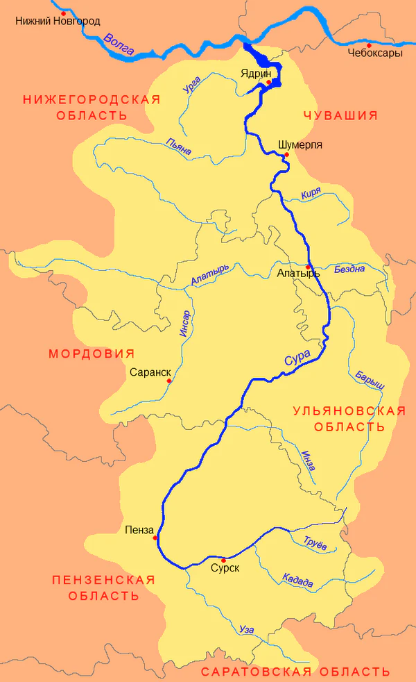 | Водная система | Сура → Чебоксарское водохранилище → Волга → Каспийское море |