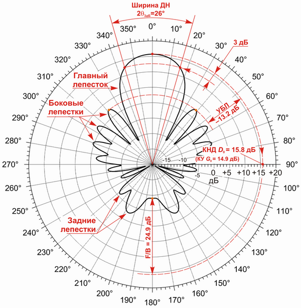 Для антенн с высокой направленностью используют также средний уровень бокового излучения (нормированная к своему максимуму ДН усредняется в секторе углов бокового излучения) и уровень дальних боковых лепестков (относительный уровень наибольшего бокового лепестка в области задних боковых лепестков).