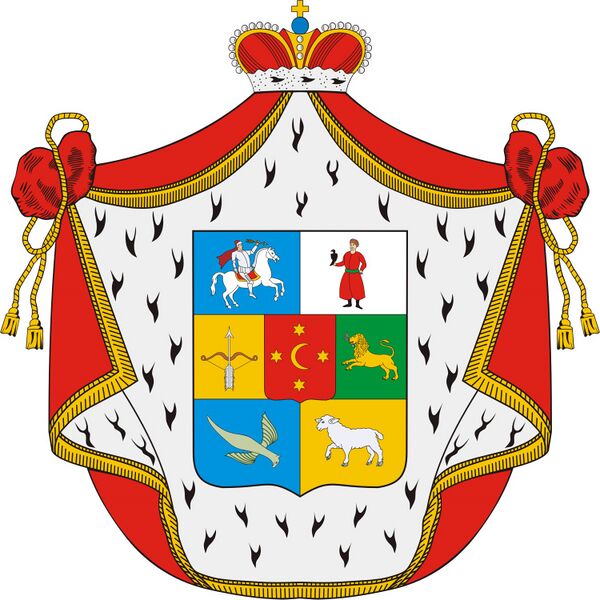 Описание герба: Выписка из Гербовника В щите, разделенном на шесть частей, в середине находится малый щиток красного цвета с изображением золотой луны, окружённой четырьмя шестиугольными звёздами того же металла. В первой части в голубом поле ездок, скачущий на белом коне, держит в левой руке стрелу. Во второй в серебряном поле муж в Татарском одеянии имеет на правой руке птицу. В третьей в золотом поле лук со стрелой, вверх летящей. В четвертой в зеленом поле изображён золотой лев, пронзённый в челюсть двумя стрелами. В пятой в голубом поле означен (летящий) дракон. В шестой части в золотом поле агнец. Щит покрыт мантией и шапкой, принадлежащими Княжескому достоинству. |