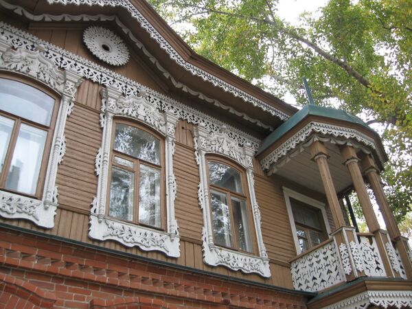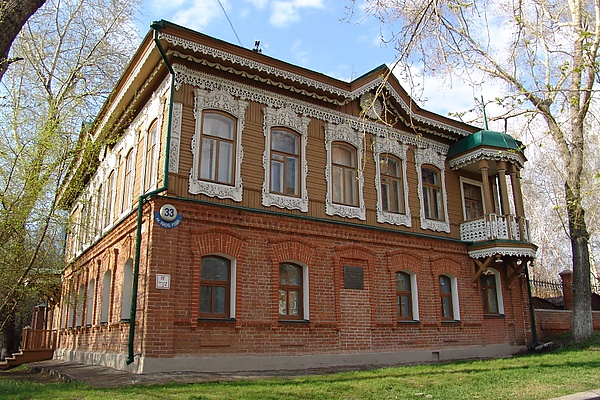 На втором этаже оконные проёмы обрамлены наличниками, декорироваными накладной и пропильной резьбой с токарными элементами и растительным орнаментом, их надоконные доски имеют профилированное завершение[1].