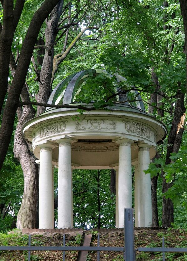 Приусадебный парк, в планировке которого использованы регулярные и живописные приёмы, имеет площадь 8,2 га. Многие аллеи парка замыкались садовыми павильонами, часть которых сохранилась. «Чайный» (или «Музыкальный») домик отличается свободной ордерной композицией, изящностью пропорций и украшен лепниной. Беседка-ротонда выделяется рёбрами покрытия, формирующими импровизированный купол. Домик и ротонда датируются 1836 годом, возможно в их доработки принимал участие архитектор А. Г. Григорьев. Дошли до настоящего времени чугунные вазы и львы на пандусе, парковые статуи, кованый козырёк над парадным крыльцом главного дома. Частично сохранился живописный декор интерьеров дома, в том числе плафон с гирляндами и грифонами в одном из залов и композиция в коридоре с романтическими руинами и путти, которая изображена в духе П. Гонзага[3][2].