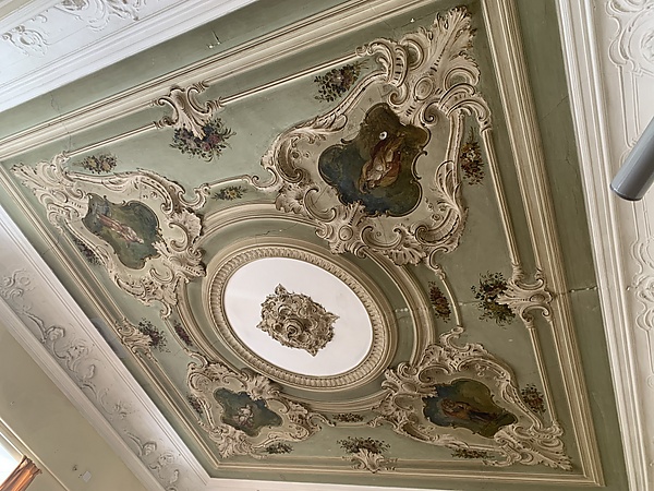 Внутри главного корпуса усадьбы имеются сохранившиеся расписные потолки. В основном это орнаменты в коридоре 1 и 2 этажей, потолок с лепниной в форме большого квадрата мужской (в настоящее время) палаты с изображениями 4-х девушек, предположительно символизирующие времена года, и орнамент потолка широкой центральной лестницы, ведущей на 3 этаж, где располагается местная администрация.