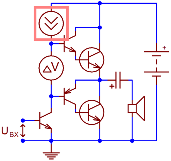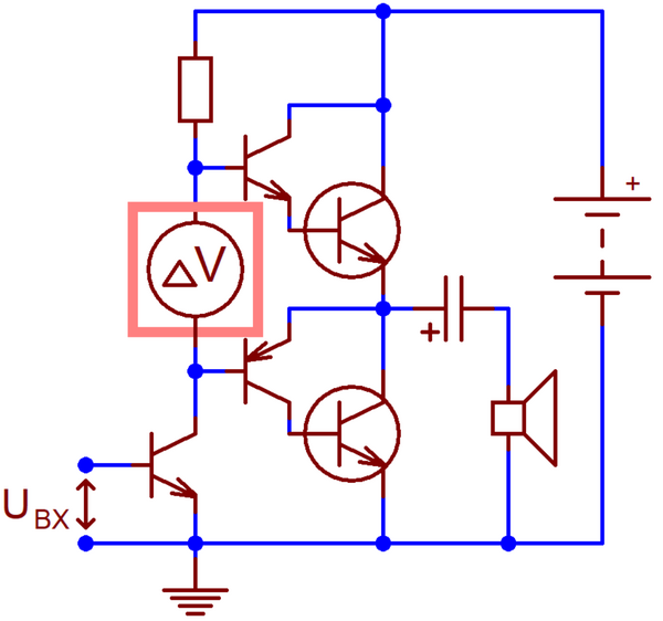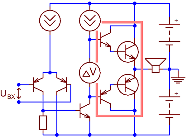 Примерно тогда же, по мере удешевления компонентов блоков питания, произошёл переход с однополярного питания УМЗЧ на двуполярное — с исключением из схемы разделительного конденсатора С4 она превратилась в полноценный УПТ[8]. В новой конфигурации условный «нуль» (потенциал эмиттера) входной цепи КУН более не совпадал с общим проводом — теперь он был привязан к подверженной всевозможным помехам шине питания (обычно отрицательной)[8]. Задача согласования опорных уровней и фильтрации помех на практике оказалась несложной: вначале её решали с помощью входного каскада на одиночном транзисторе, а на рубеже 1960-х и 1970-х годов конструкторы впервые применили дифференциальный входной каскад[8]. По странному стечению обстоятельств дифференциальный каскад, применявшийся в ламповых вычислительных машинах и промышленной автоматике с 1940-х годов, не использовался конструкторами звуковой аппаратуры до середины 1960-х годов, когда инженеры RCA популяризовали его применение в схемах на новейших кремниевых транзисторах[18]. Превосходство дифференциального каскада над предшествовавшими ему схемами было столь велико, что уже в первую половину 1970-х годов он вытеснил их и стал непременным, безальтернативным компонентом транзисторных УМЗЧ[18].