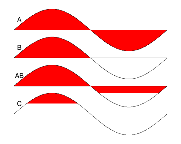 - класс «AB» — режим работы двухтактного каскада, промежуточный между режимами А и В. Угол отсечки каждого активного прибора существенно больше 90°, но меньше 180°.