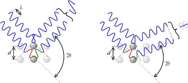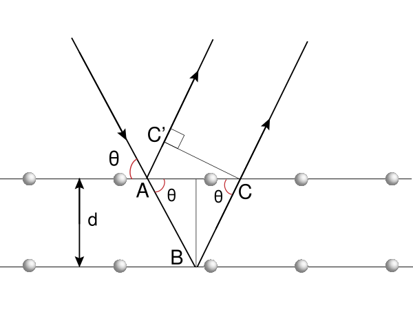 Пусть плоская монохроматическая волна любого типа падает на решётку с периодом d, под углом θ, как показано на рисунке. Как видно, есть разница в путях между лучом, отражённым вдоль AC' и лучом, прошедшим ко второй плоскости атомов по пути AB и только после этого отражённым вдоль BC. Разница в путях запишется как