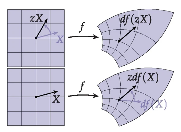 Если рассматривать множество комплексных чисел как векторное пространство над , то значение производной функции в точке является линейным отображением из 2-мерного векторного пространства в себя (-линейность). Если же рассматривать как одномерное векторное пространство над , то и производная в точке будет линейным отображением одномерного векторного пространства в себя (-линейность), которое в координатах представляет собой умножение на комплексное число . Очевидно, всякое -линейное отображение -линейно. Так как поле (одномерное векторное пространство) изоморфно полю вещественных матриц вида с обычными матричными операциями, условия Коши — Римана, накладываемые на элементы матрицы Якоби отображения в точке (точнее, отображения в точке ), являются условиями -линейности , т.е. .