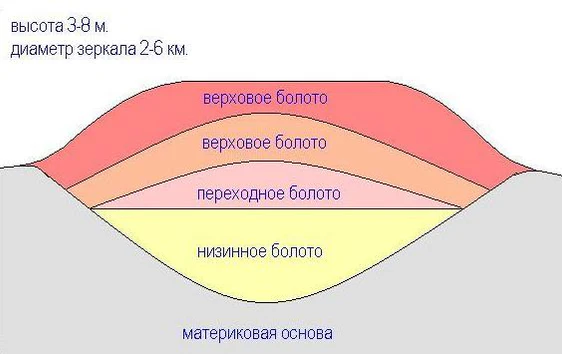 Иногда развитие торфяника идёт по другому сценарию. Тогда болото будет состоять преимущественно из переходного, или даже из верхового типа торфов.[3]:369