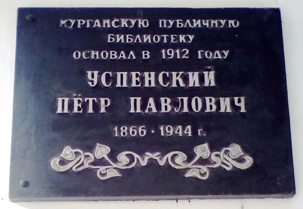 На здании Курганской областной универсальной научной библиотеки имени А. К. Югова по адресу ул. Комсомольская, д. 30, установлена памятная доска, отражающая заслуги П. П. Успенского в основании библиотеки: «Курганскую публичную библиотеку основал в 1912 году Успенский Пётр Павлович 1866—1944 г.».[12]