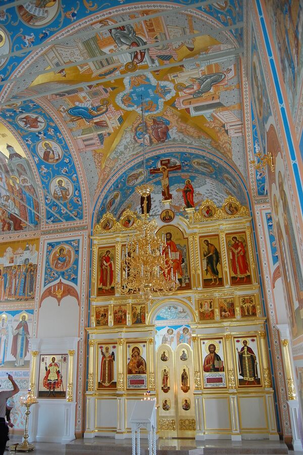 В Успенском соборе на западной стене находятся композиции, отражающие содержание книги Соломоновой «Песнь Песней». В люнетах — полукруглых нишах северного, южного и западного порталов — образы Божией Матери. Образы Пресвятой Богородицы (Донской, Смоленский, Иверский и другие) размещены также над окнами. Значительную часть западного свода занимает фреска Успение Пресвятой Богородицы. В восточном своде размещена композиция «Предста царица одесную тебе», в центре которой — Спаситель, восседающий на престоле, одетый в царские ризы; Христос предстаёт здесь как символ высшей справедливости, как Царь царствующих, как образ верховной власти над теми, кому дана земная власть над людьми. По сторонам от него — предстоящие Божия Матерь в одеянии царицы и Иоанн Предтеча.
