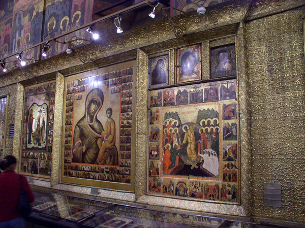 У южной стены в бронзовых иконостасах, установленных в конце XIX века, помещены иконы XVI—XVII столетий. Среди них «Митрополит Пётр в житии», предположительно, написанная, Дионисием[82][83]. В северном иконостасе находятся образы, привезённые в 1923 году из Соловецкого монастыря: «Богоматерь Боголюбская, с житием Зосимы и Савватия Соловецких», «Достойно есть», «Сошествие во ад» и другие[84].