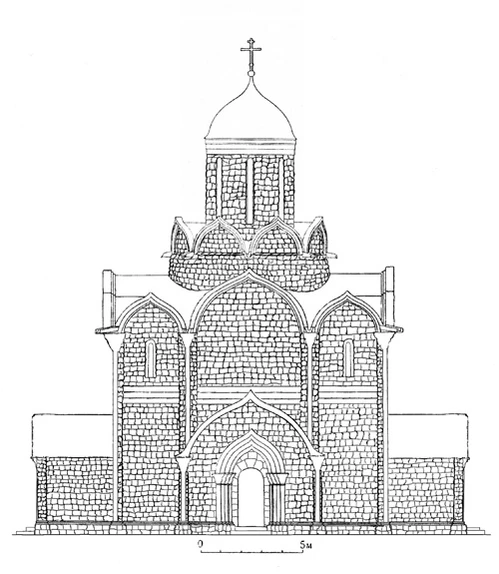 Белокаменный пятиапсидный пятиглавый собор разделён на двенадцать одинаковых по величине квадратов, перекрытых крестовыми сводами. Четыре столпа имеют круглую форму, остальные два — крестчатую[62][63][28]. Из кирпича выложены своды, барабаны, восточная стена над алтарными апсидами, скрытые алтарной преградой восточные квадратные столпы. Круглые столпы также кирпичные, но облицованы белым камнем. Фасад храма состоит из простенков-прясел, разграниченных лопатками и завершённых полукружиями закомар[64]; на северной и южной стенах по четыре таких прясла, на западной и восточной по три[28]. По горизонтали здание разделено декоративным поясом из маленьких колонн и арок. В стенах прорезаны узкие щелевидные окна. Апсиды собора невысоки и прикрыты с юга и с севера пилонами[65][66]. Собор увенчан группой из пяти куполов, смещённых к востоку[28].