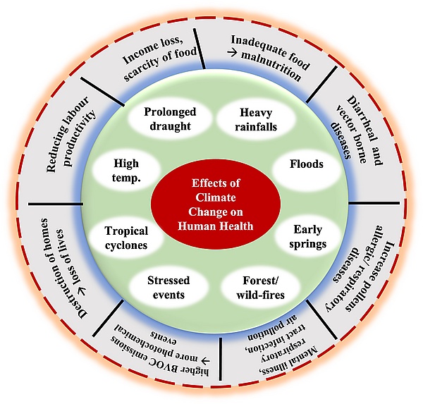 Человечество сталкивается с разнообразными угрозами для здоровья: травмы, вызванные экстремальными погодными условиями, обострение респираторных заболеваний из-за загрязнения воздуха, увеличение числа трансмиссивных заболеваний, рост риска зоонозных инфекций, проблемы с питанием из-за неурожаев, заболевания, связанные с глобальным потеплением[7].
