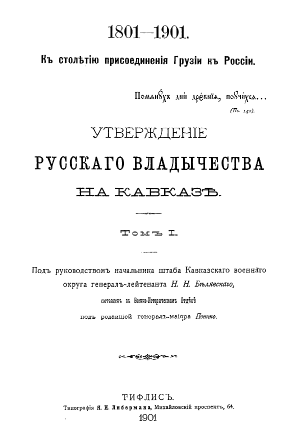 | Гражданское управление Закавказьем от присоединения Грузии до наместничества Великого князя Михаила Николаевича | 1901 | Тип. Канцелярии Главноначальствующего гражданской частью на Кавказе | 524 |