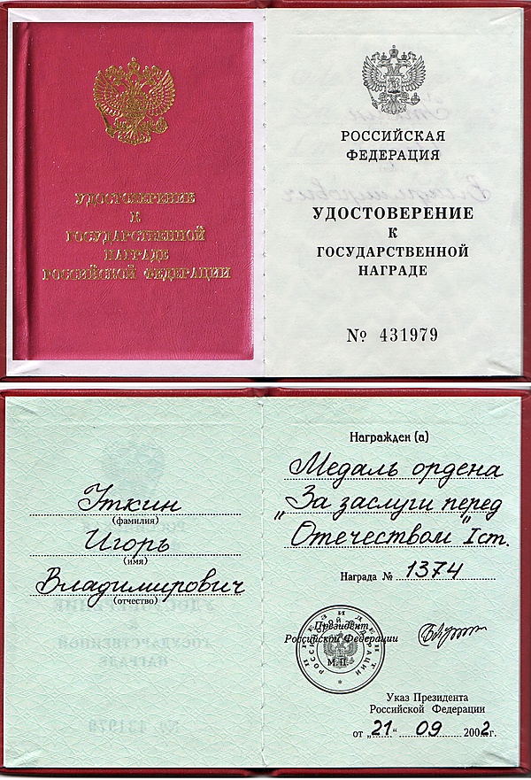 - Медаль ордена «За заслуги перед Отечеством» I степени (2002).