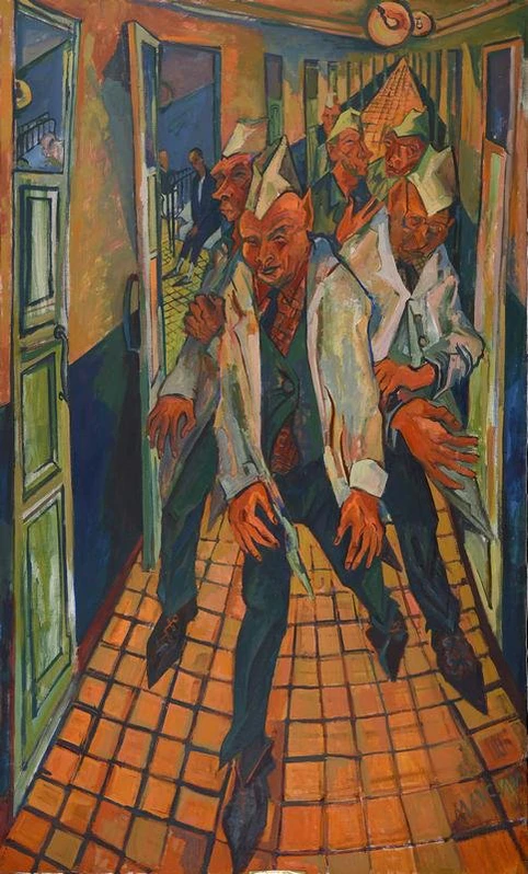 На полотне представлен больничный коридор, выполненный с использованием сильного перспективного сокращения. На переднем плане изображены пятеро мужчин-врачей в белых халатах, идущих по коридору навстречу зрителю; лица и руки персонажей выделены насыщенным красным цветом, что создаёт выразительный акцент в цветовой гамме. Слева находится открытая дверь, за которой виден сидящий на постели больной, что подчёркивает характер сцены как примера бытового жанра и передаёт атмосферу медицинского интерьера.