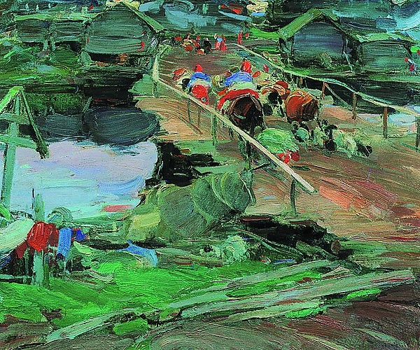 На картине изображена северная деревня с характерными для русского Севера домами и сараями с покатыми крышами, расположенными на противоположном берегу широкой реки, горизонтально пересекающей полотно. Справа через реку переброшен низкий деревянный мост, по которому едут женщины в цветастых одеждах на телегах, запряжённых лошадьми. На переднем плане изображён зелёный берег и широкая серовато-лиловая дорога, ведущая к мосту, а слева у дороги установлен деревянный придорожный крест.