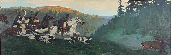 На панно изображён утренний пейзаж с холмами, покрытыми густым лесом, и елями, возвышающимися справа. Слева группа из трёх охотников на лошадях преследует лося, изображённого на переднем плане справа. Охотников сопровождают чёрно-белые собаки. В центре выделяется всадник на белой лошади в островерхой шапке с копьём, за ним следуют ещё два охотника, один из которых трубит в рог; по левому краю видна голова лошади и часть рога. Вдали холм, освещённый первыми лучами солнца, а на голубом небе — розовые облака. Сцена относится к бытовому жанру, отражая повседневную жизнь и традиции охоты. В работе подчёркнуты детали композиции и использование утренних оттенков в цветовой гамме.