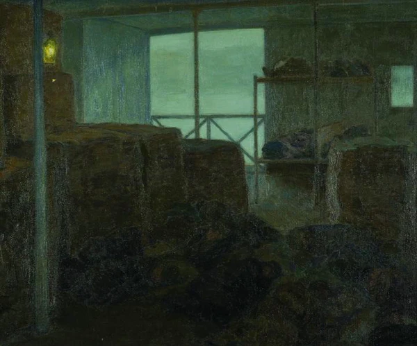 На картине представлен вид внутреннего пространства речного пассажирского парохода, относящийся к бытовому жанру. Через дверной проём открывается туманное серое небо, что добавляет элемент пейзажа. На затемнённой палубе располагаются фигуры сидящих пассажиров, среди которых размещены ящики и тюки. Освещение сцены создаётся слабым светом, проникающим снаружи, а также тусклым фонарём, закреплённым на стойке слева. В глубине композиции видны нары с сидящими людьми, что подчёркивает атмосферу и социальную направленность изображения.