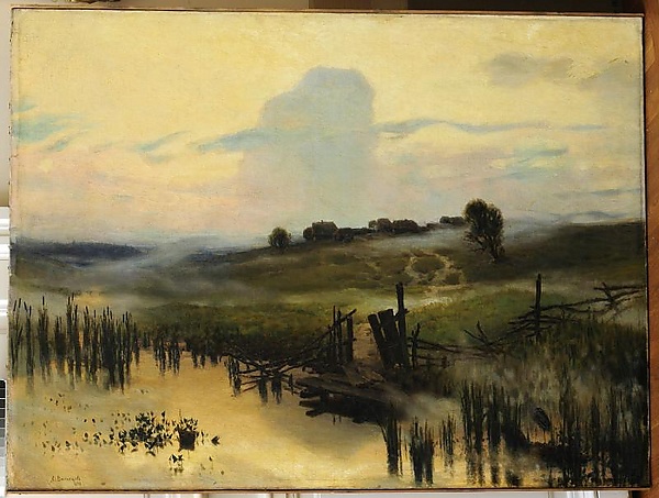 На первом плане изображён заросший камышом пруд, к которому ведут деревянные сходни. Справа вдали, на зелёном холме, расположена небольшая деревня и несколько деревьев. Слева видна низина, над которой стелется туман. Почти половину пространства занимает небо, освещённое розовато-жёлтыми лучами восходящего солнца. В центре композиции выделяется большое серое облако, а в воде отражается небо. В правой части, среди камышей, находится одинокая цапля.