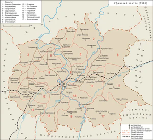 В 1926 году на момент Всероссийской переписи населения в состав Уфимского кантона входило 17 волостей, 1 город (Уфа), 4 городских (пгт. Благовещенский завод, пгт. Красный ключ, пгт. Чишмы, пгт. Шингак-Куль) и 2178 сельских населенных пунктов[1][2][7][12].