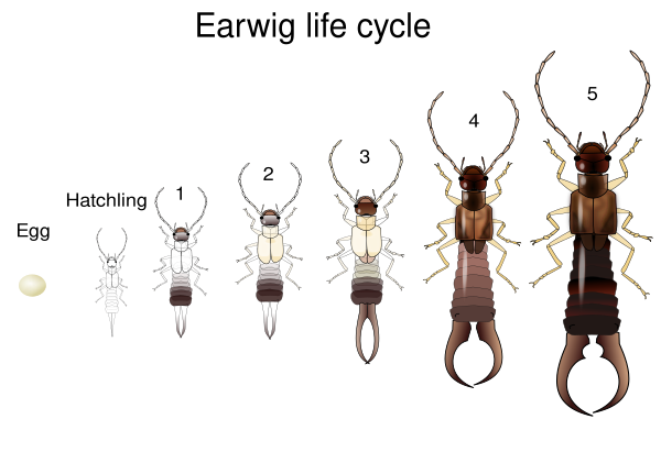 В течение первого года жизни уховёртка проходит через все стадии развития — яйца, личинки и взрослого насекомого (так называемое неполное превращение)[16].