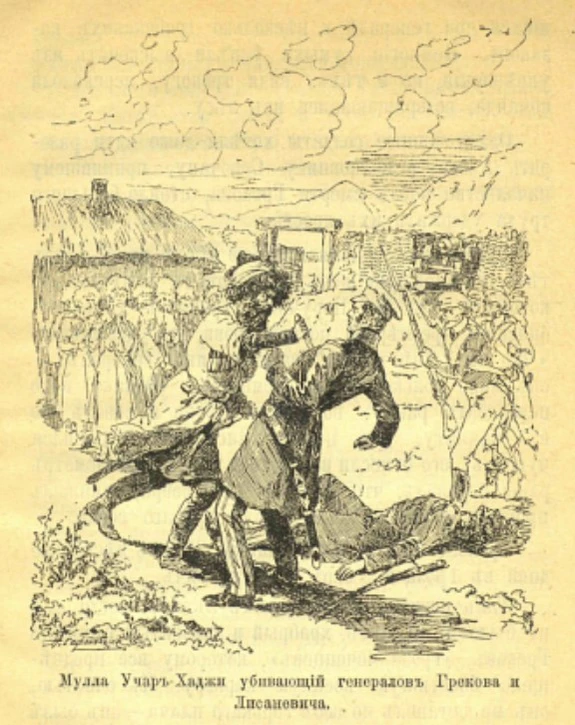 Япишка разсказывалъ мнѣ, какъ Грековъ и Лесаневичь призвали въ Герзель-аулъ стариковъ изъ Стараго Аксая и Учаръ-Аджи, который былъ подозрѣваемъ въ продажѣ товаровъ Немирнымъ. — Объяснивъ имъ, что поступки Учаръ-Аджи противузаконны и что его должно взять, они старались успокоить другихъ Татаръ, но какъ только Учаръ-Аджи, который въ воротахъ, гдѣ отбирали у всѣхъ оружіе, успѣлъ скрыть въ рукавѣ кинжалъ, услыхалъ, въ чемъ дѣло, онъ бросился на Грекова, закололъ его, потомъ Лисеневича, хотѣлъ тоже срубить Муссу Хасаева, но Бегичевъ ударомъ шашки успѣлъ повалить его. Всѣхъ Татаръ, которые были тутъ, убили. — Въ томъ числѣ и Япишкинаго пріятеля, Парабочевскаго охотника, казака Данилу[43].